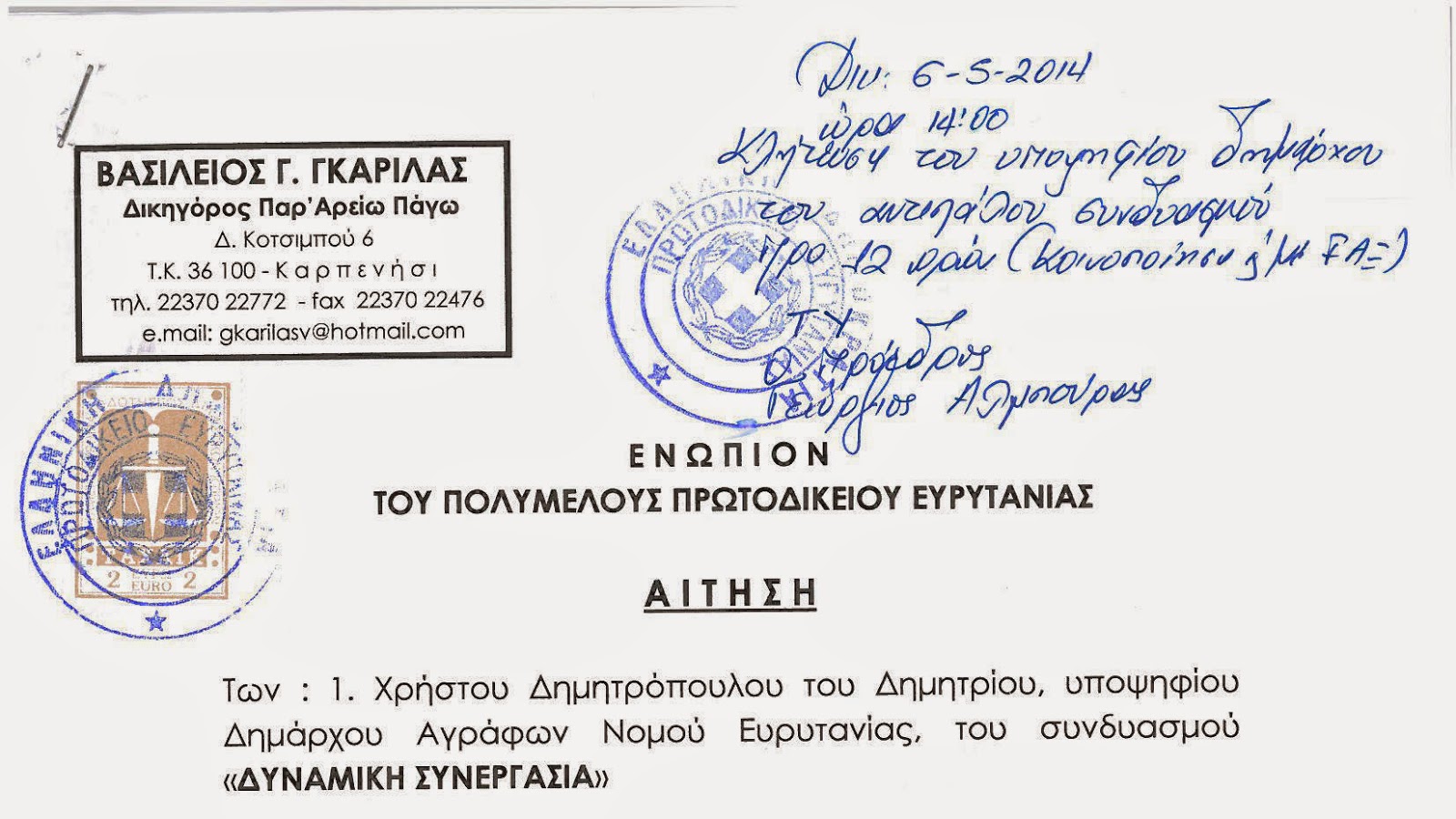 Σήμερα η το αργότερο αύριο θα εκδοθεί η τελεσίδικη απόφαση του Πρωτοδικείου Ευρυτανίας για τον Συνδυασμό του. Προχθές το μεσημέρι εκδικάστηκε η ένσταση που κατέθεσε ο Χρήστος Δημητρόπουλος για αναίρεση της απόφασης.Σύμφωνα με το ρεπορτάζ πέραν της ενστάσεως κατατέθηκε και πλήρης νέος φάκελος του συνδυασμού καθώς και υπόμνημα που τόνιζε την παραδρομή στην κατάθεση του συνδυασμού,